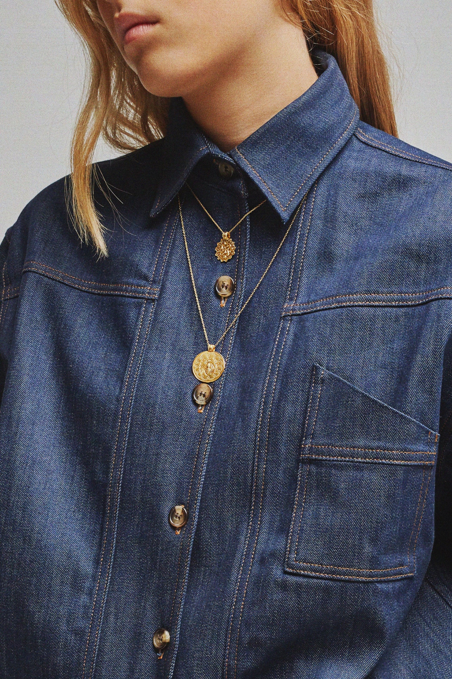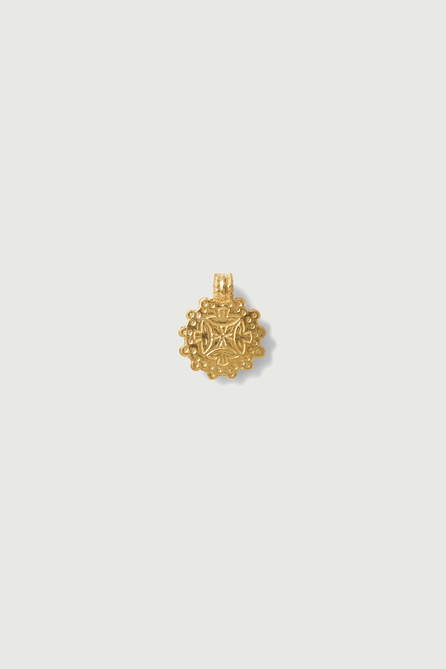 DOMITILLE 2 es un colgante redondo de vermeil decorado con una golondrina. Los motivos del interior de la medalla están grabados a martillo.