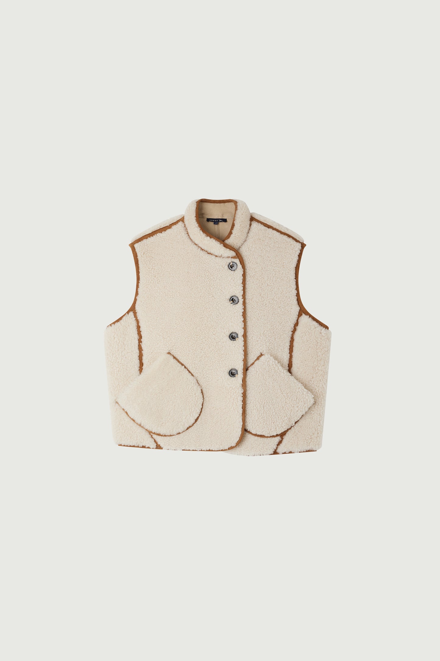 ARNOLD es un chaleco de piel de borrego de talla grande que se puede usar en capas a gusto o meter debajo de un abrigo amplio. Su forro es especialmente cálido. Un juego de cintas de piel natural resalta los bolsillos redondos, el cuello alto y los paneles que componen la prenda.