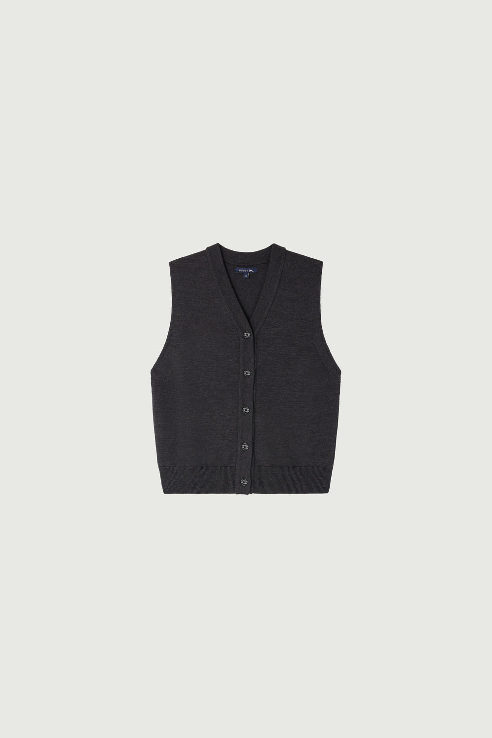 CHIARA es un pequeño cárdigan corto sin mangas. Su corte es ajustado al cuerpo, mientras que el escote en V y la abertura con botones en el frente añaden un toque de sofisticación. Perfecto para superponer y crear looks elegantes y contemporáneos.