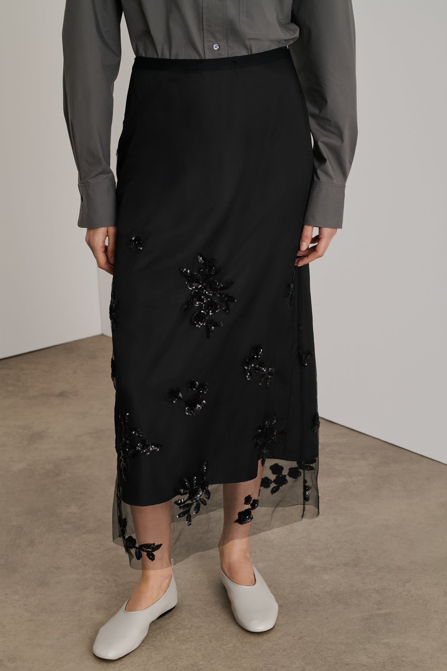GRACE es una elegante falda larga de tul y apliques bordados. Se compone de dos partes: una enagua forrada para limitar las transparencias y una falda de tul negro bordada de abajo arriba con elementos florales de lentejuelas negras. Se cierra con dos cremalleras invisibles. Esta falda versátil se puede llevar con o sin su enagua, según lo atrevida que seas.