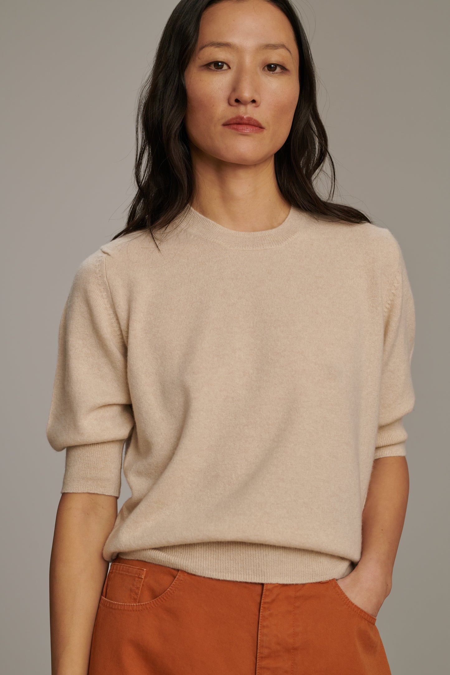 BAIE es un pequeño jersey de mangas cortas, como una camiseta de invierno. Tejido con hilo de cachemir, su suavidad se lleva directamente sobre la piel. Su corte es recto y amplio, separado del cuerpo para asegurar comodidad y facilidad.