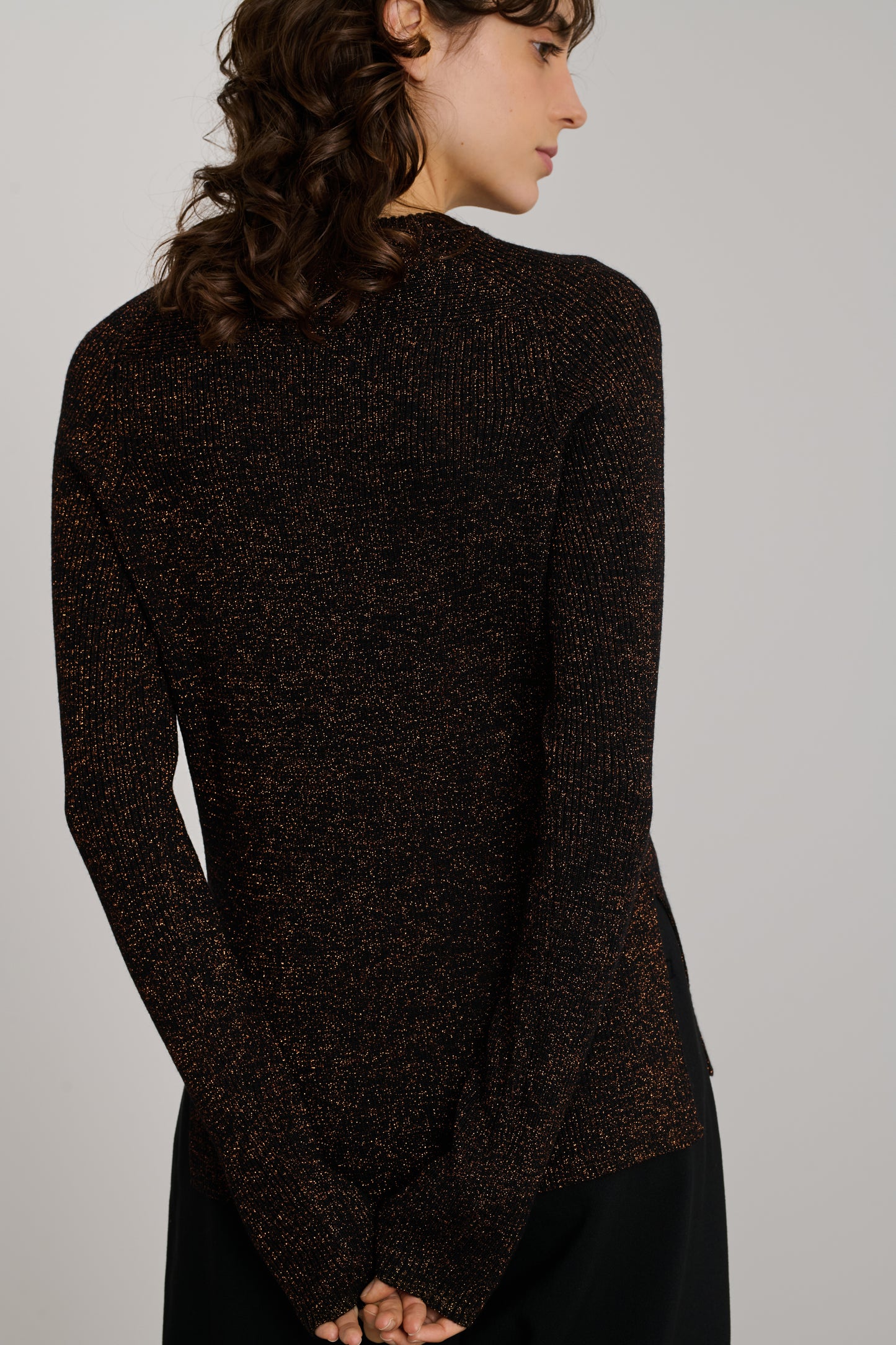 VERONA es un jersey acanalado tejido con hilo de lana merina, mezclado con lúrex para conseguir un efecto iridiscente. Tiene un corte recto y ceñido y un escote redondo.